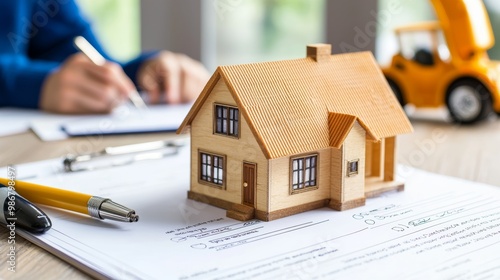 A wooden toy house is placed on documents, symbolizing real estate, while a person prepares notes in the background, hinting at planning or transactions.