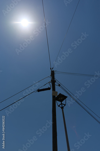 utility pole, powerline, electricity, lamp-post, sky, sun, light, phone, communication, urban, industrial, silhouette, energy, technology, daytime, summer, bright, street, electric, infrastructure, pole, wire, clear, sunlight