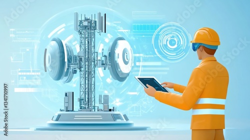A worker in a hard hat uses a tablet to interact with a futuristic telecommunications tower, surrounded by digital interfaces.