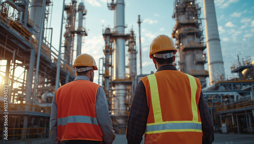 A worker in a yellow safety suit and helmet is standing near an oil and gas industry plant with a blue sky background, looking at the ground, viewed from behind.