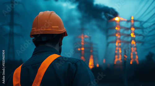 A worker in an orange safety helmet observes a power station engulfed in smoke and flames, highlighting industrial hazards and emergency response.