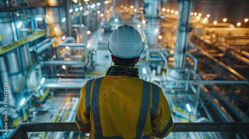 A worker in high-visibility clothing surveys the complex infrastructure of an industrial plant from an elevated platform.