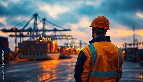 A worker in safety gear stands at the port's container yard, observing cargo ships and cranes against the twilight sky.