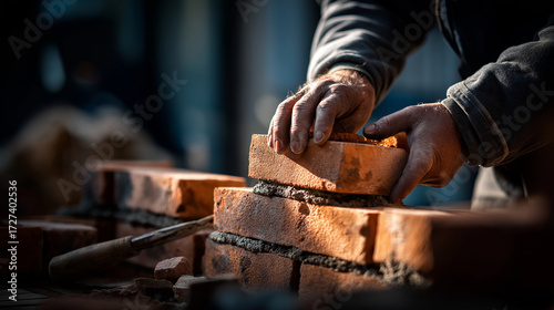A worker lays bricks at a construction site hyper realistic brick textures with clear details moody shadows on the wall bright saturation in masonry tools bricklaying