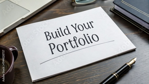 A workspace with a document d "Build Your Portfolio" alongside a pen and coffee cup.