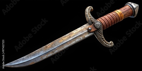 A worn, ornate pirate sword boasts a curved blade, its edge honed to perfection, grasped firmly in a handle adorned with intricate engravings.