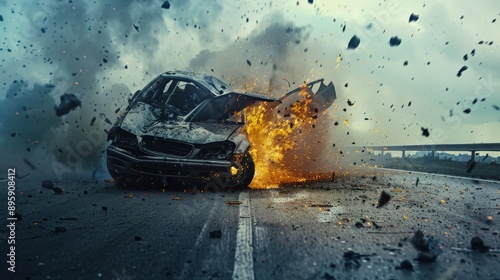car, burning, fire, explosion, debris, smoke, highway, road, asphalt, storm, sky, wreckage, damage, accident, crash, destruction, vehicle, abandoned, desolate, dangerous, flammable, intense, heat, flames, danger, chaos, disaster, impact, aftermath, scene, dramatic, catastrophic, tragic, automotive, transportation, traffic, emergency, black, grey, blue, yellow, orange, dark, bright, colours, visual
