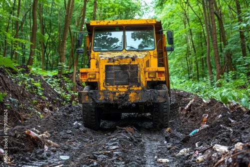 dump truck, forest, vehicle, waste, debris, environmental impact, pollution, tree, greenery, nature, construction, heavy machinery, landscape, trash, litter, rustic, machinery, rural area, nature conservation, roadwork, waste management, dirt, forestry, equipment, sustainability