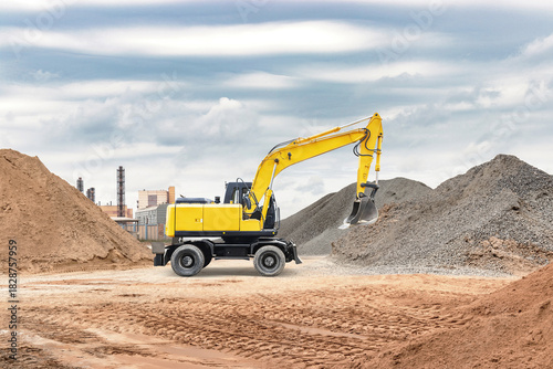 A yellow excavator operates on a construction site, digging and moving material next to large mounds of sand and gravel under an overcast sky