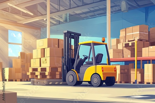 forklift, warehouse, yellow, box, cardboard, storage, industrial, machinery, transport, logistic, cargo, pallet, shelf, loading, unloading, stacked, work, building, equipment, transportation, inside, floor, steel, truck, lift, handle, wheel, tire, sky, window, light, beam, roof, metal, blue, brown, beige, grey, white, red, orange, sun, shadow, empty, concrete, structure, heavy, duty