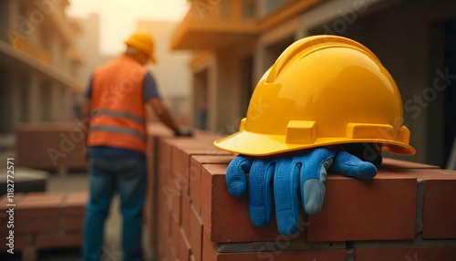 A yellow hard hat and a pair of blue work gloves resting on a pile of bricks, suggesting a construction site or work environment