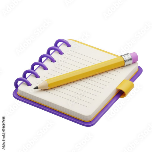 A yellow pencil rests on an open spiral notebook isolated on transparent background
