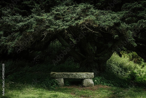 A yew tree with dark green foliage and a stone bench beneath its branches.