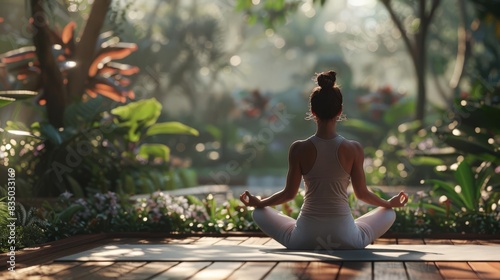 A yoga instructor leading a peaceful morning class in a serene garden close up, tranquility theme, realistic, blend mode, garden backdrop