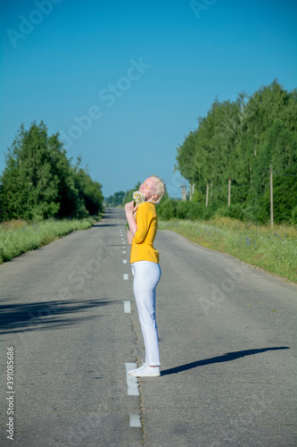 A young albino woman in yellow, standing on the road, holding a bouquet of daisies. against the blue sky.