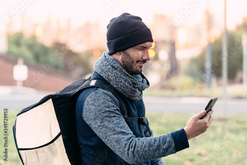 A young and attractive male with beanie and scarf checks his smart phone for new food take away delivers