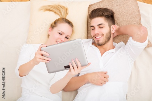 A young and happy couple with a tablet PC in bed from above..