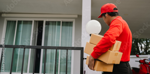 A young Asian deliveryman in uniform smiles while delivering a cardboard package to a customer’s home, ensuring safe and timely shipment.