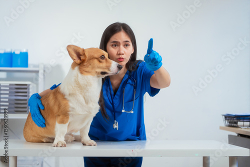 A young Asian female veterinarian gently examines a calm Corgi dog indoors at pet clinic, highlighting professional pet care, importance of regular health checkups and vaccinations like rabies shots.
