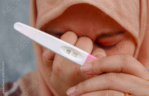A young Asian muslim woman covers her face with her hand and cries, in her other hand there is a negative pregnancy test. A woman's desire to have children.