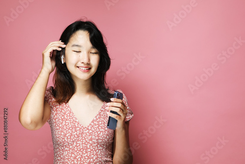A young Asian woman smiling and listening to music with yearphones, holding a mobile in her hand on a pink background,