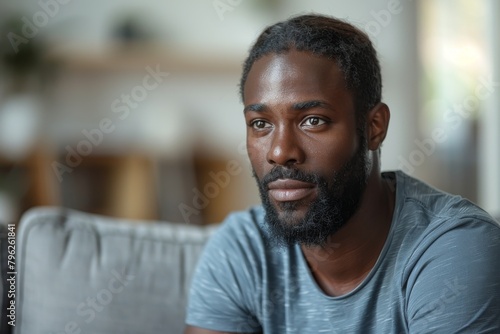 man, peace, beard, contemplation, thinking, relaxation, calmness, young adult, pensive, introspection, african, facial expression, casual attire, indoor, home, calm, serene, contemporary, solitude, lifestyle, sharpened, eye, seated, realism, authenticity, natural light, soft focus, modern, comfort, individuality, depth