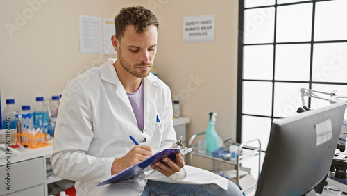 man, laboratory, bearded, clipboard, white, coat, young, indoor, writing, bright, scientist, research, professional, medicals, health care, adult, male, doctor, laboratory, science, equipment, work, study, clinic, medicine, technician, analysis, education, hospital, researcher, experiment, occupation, chemist, health, notebook, concentration, pharmaceutical, discovery, safety, goggles, datum, test, scrub, control, expert, analysing, professionalism, career