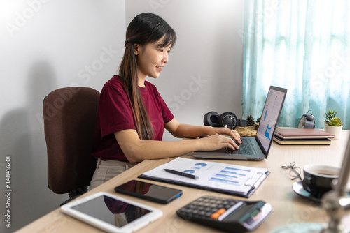 A young, beautiful relaxing business asian girl use a laptop working remotely from home on desk as a freelancer, quarantine for Coronavirus and smart working concept.
