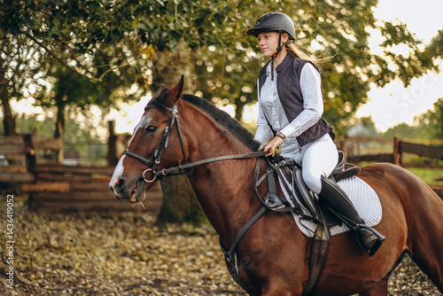 A young beautiful woman jockey is preparing for a show jumping competition. A woman rider rides a brown racehorse.