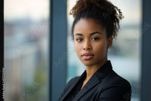 A young Black businesswoman dressed in a sharp suit, confidently standing in a modern corporate office, looking directly at the camera with a professional yet approachable expression. The glass