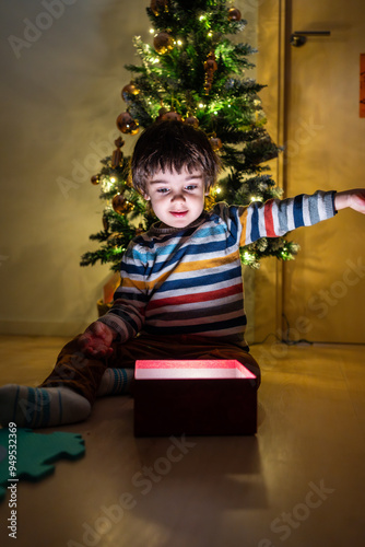 A young boy is sitting in front of a Christmas tree and opening a red box