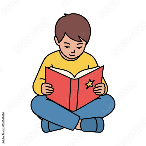 boy, children, reading, book, red, cover, star, yellow, sweater, blue, pant, cross-legged, sitting, illustration, cartoon, simple, design, education, learning, literacy, story, imagination, creativity, relaxation, leisure, hobby, activity, young, male, person, human, figure, pose, position, clothing, attire, outfit, casual attire, informal, friendly, approachable, smiling, happy, content, engrossed, focused, absorbed, intrigued, curious