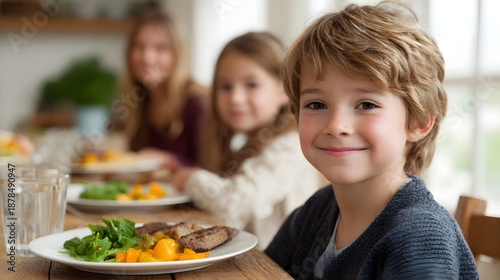 A young boy smiles brightly as his family gathers for a healthy and happy meal around a wooden dining table