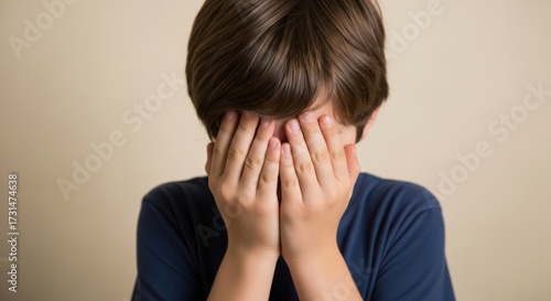 A young boy with brown hair, wearing a blue shirt, covering his face with his hands.