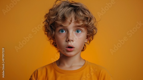 ai, technology, boy, children, children, surprised, shocked, amazed, wow, expression, face, eye, mouth, open, wide, hair, curly, blond, yellow, background, t-shirt, clothing, portrait, studio, emotion, feeling, reaction, startled, astonished, wonder, awe, disbelief, curious, inquisitive, playful, funny, humor, cute, adorable, innocent, childhood, youth, young