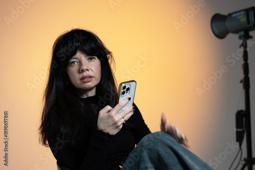 woman, brunette, young, phone, make-up, mirror, talking, calling, photo, reading, smile, smiling, posing, model, fashion, beautiful, beauty, looking, hair, long, catwalk, eye, lady, construction, building
