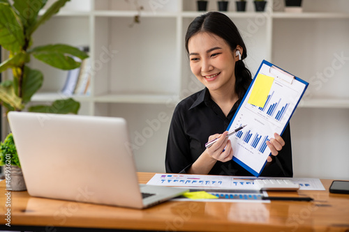 A young business Asian woman working on laptop computer in modern office. doing finances, accounting analysis, report data pointing graph Freelance education and technology concept.