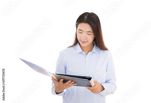 female, lady, girl, woman, young, pretty, business, commerce, profession, clerk, job, working, person, character, chinese, asian, oriental, long hair, watch, view, file, folder, shirt, white background, indoor, alone, careful, serious, work, employee, mature, formal, businesswoman, isolated, white, portrait, beautiful, tablet, book, people, beauty, smile