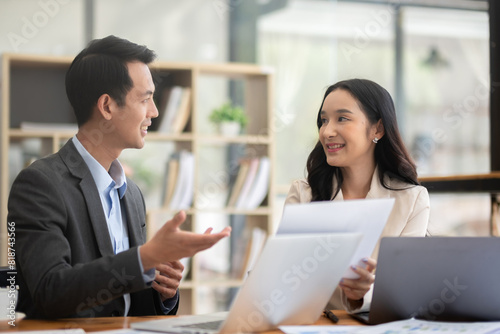 A young businessman and a female Asian accountant are discussing financial accounting and business planning together in the office.