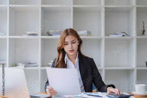 businesswoman, woman, office, desk, business, working, document, calculating machine, paperwork, finance, analysis, accounting, laptop, professional, job, executive, manager, employee, corporate, confident, adult, young, caucasian, female, person, indoor, workplace, interior, bookshelf, organisation, tidy, planning, strategy, report, financial, budget, chart, graph, datum, statistic, information, bookkeeping, earning, commerce