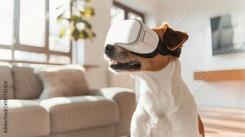 A young cheerful dog sits in a modern room, wearing a white VR virtual reality headset. daylight