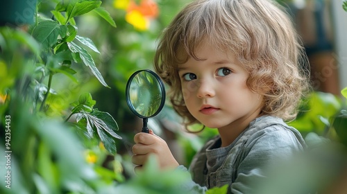 A young child holding a magnifying glass and looking at a plant. The child appears to be curious and interested in the plant