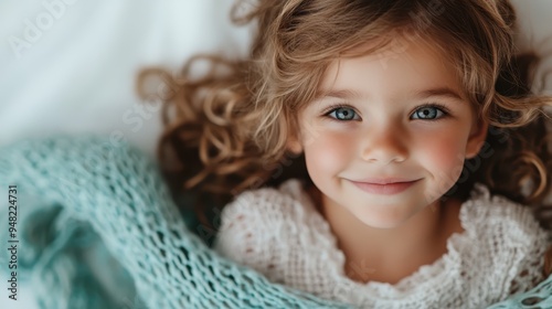 A young child with curly blonde hair and blue eyes is wrapped in a teal knitted blanket, smiling warmly. Indoor lighting highlights the child’s tenderness and joy.