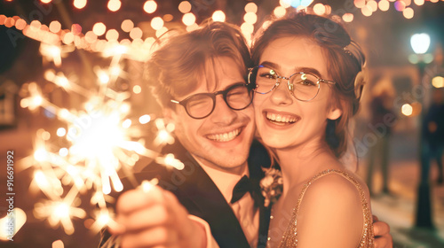 A young couple in formal wear, beams with happiness as they hold sparklers and pose for a photo against a backdrop of warm, festive lights