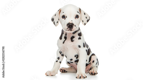 dalmatian, puppy, dog, pet, cute, playful, white background, isolated, sitting, canino, hi-res, portrait, studio shot, front view, friendly, alert, charming, well-groomed, photogenic, purebred, companion, loving, affectionate, obedient, happy, relaxed, gentle, small dog, looking up, high-quality, adorable, curious, innocent, indoor, calm, elegant