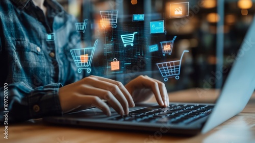 A young entrepreneur browsing an e-commerce site on a laptop, with virtual shopping carts and price tags floating around the screen