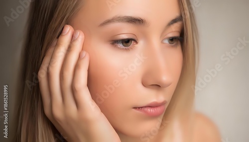 A young European beauty with long white hair and natural makeup touches her face with her hand, her skin flawless. Sophisticated language.
