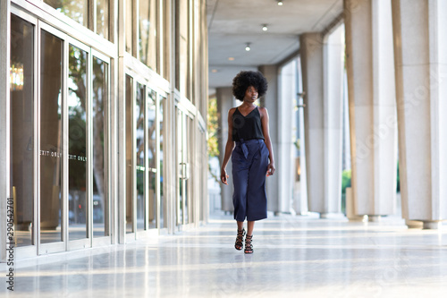 A young fashionable Afro-American woman confidently walking down the hall outside the financial building