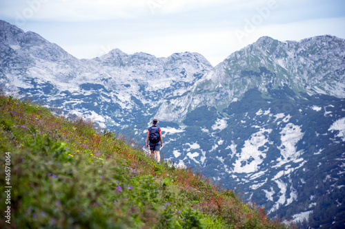 A young female hiker does trail hiking to the top of the Loser Mountain in the Styria region in Austria.