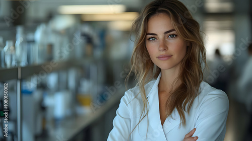 A young female scientist in a lab coat confidently posing in a bright, modern laboratory with soft lighting and blurred scientific equipment in the background